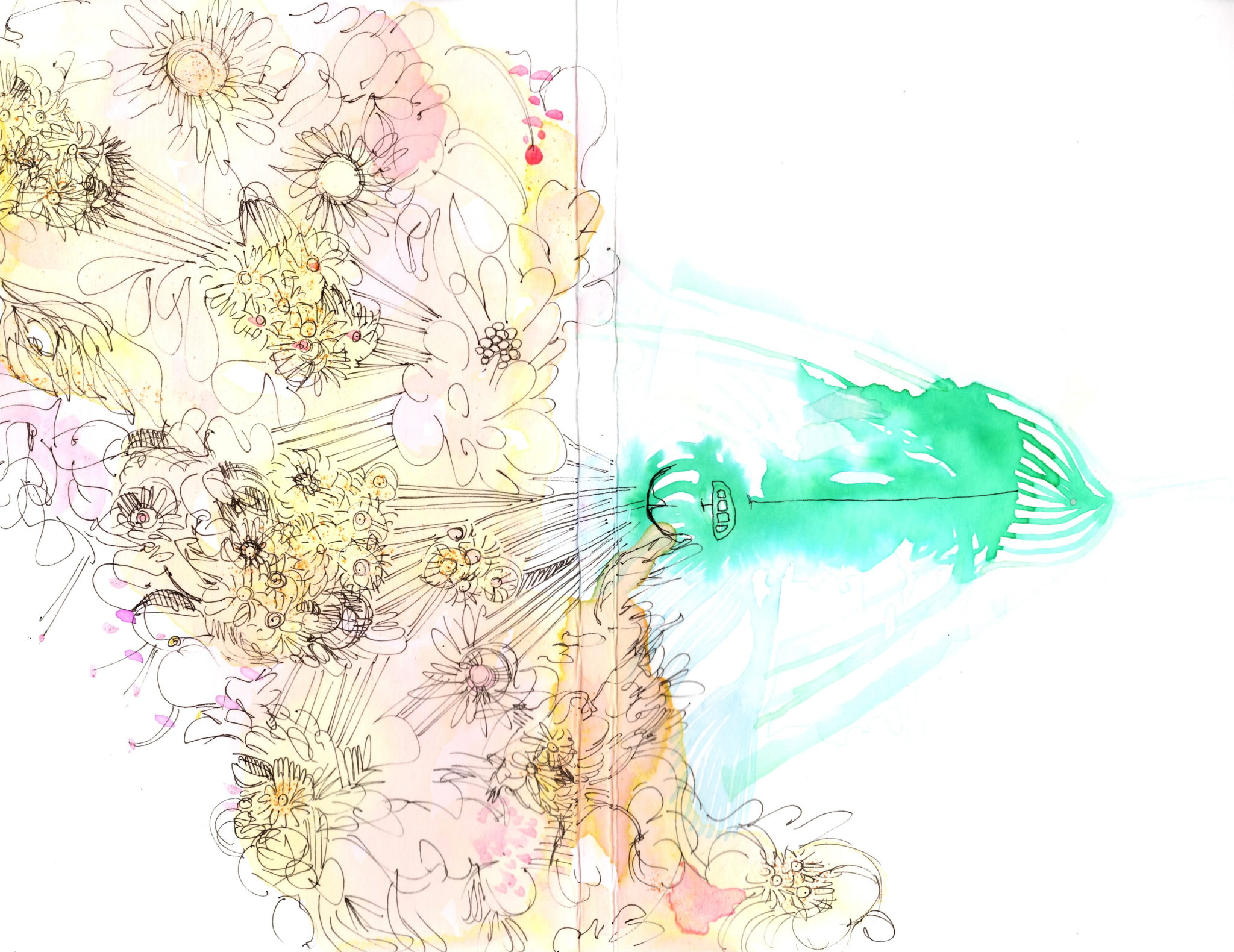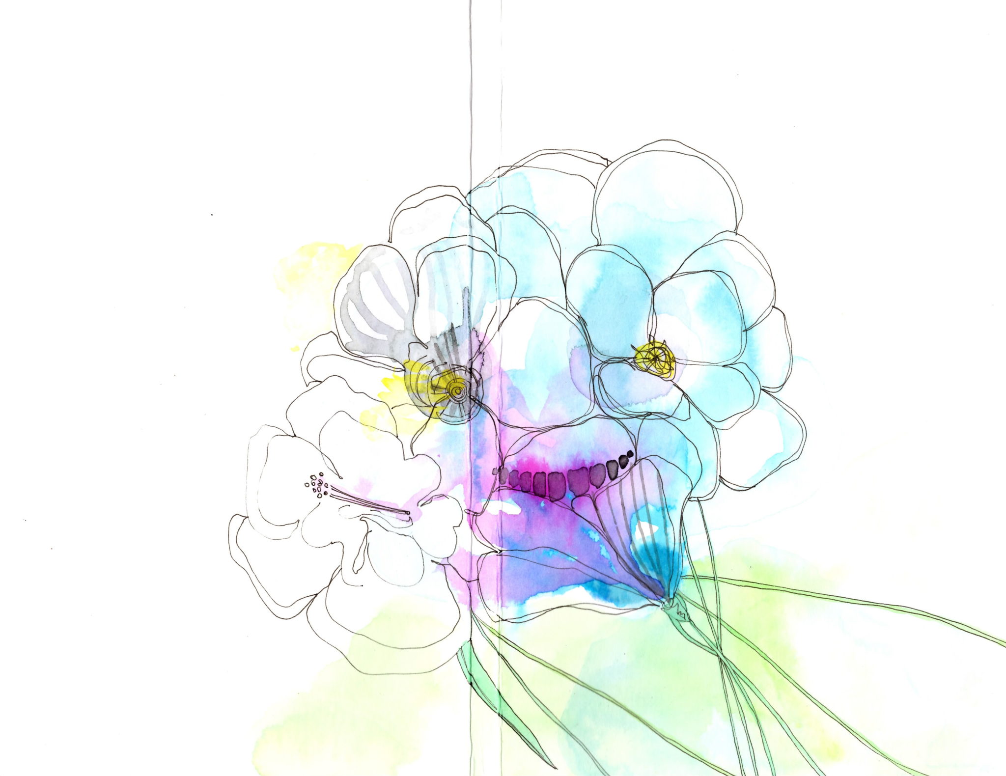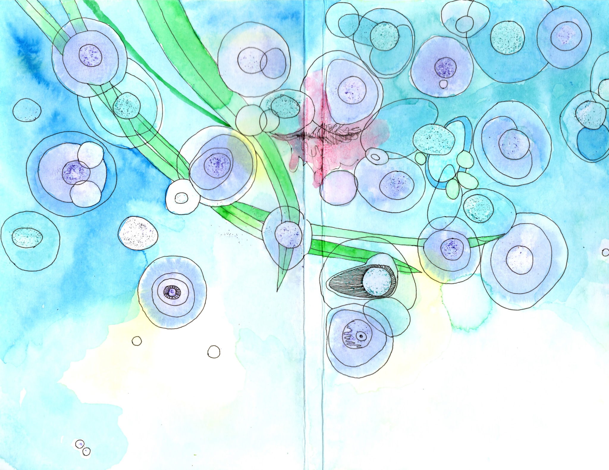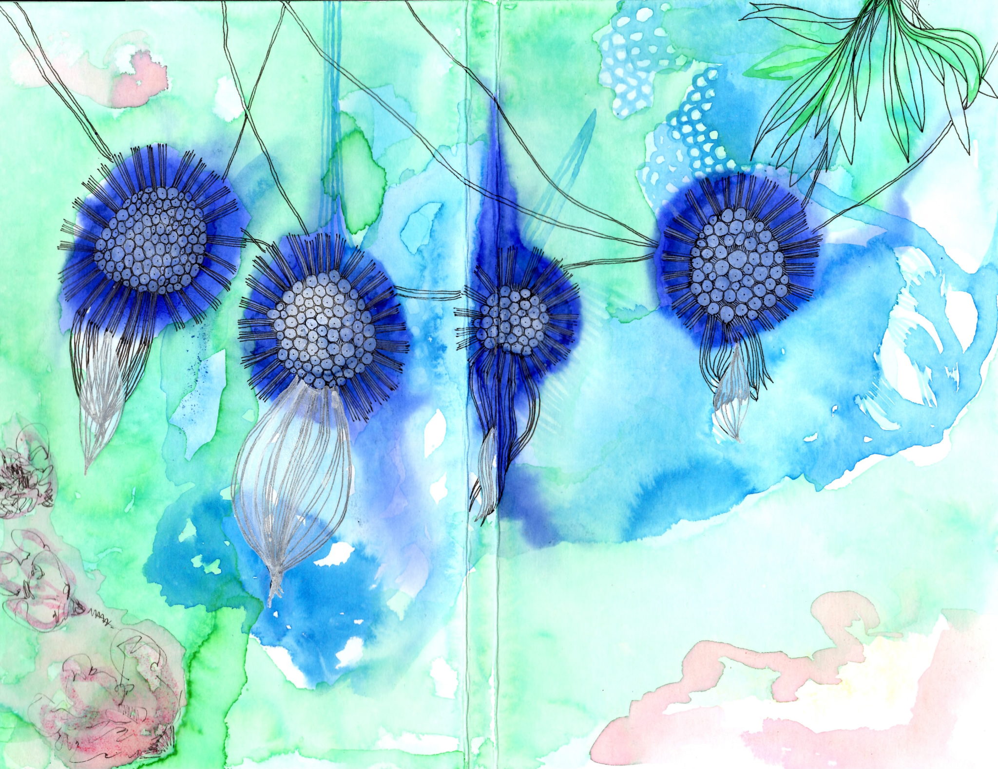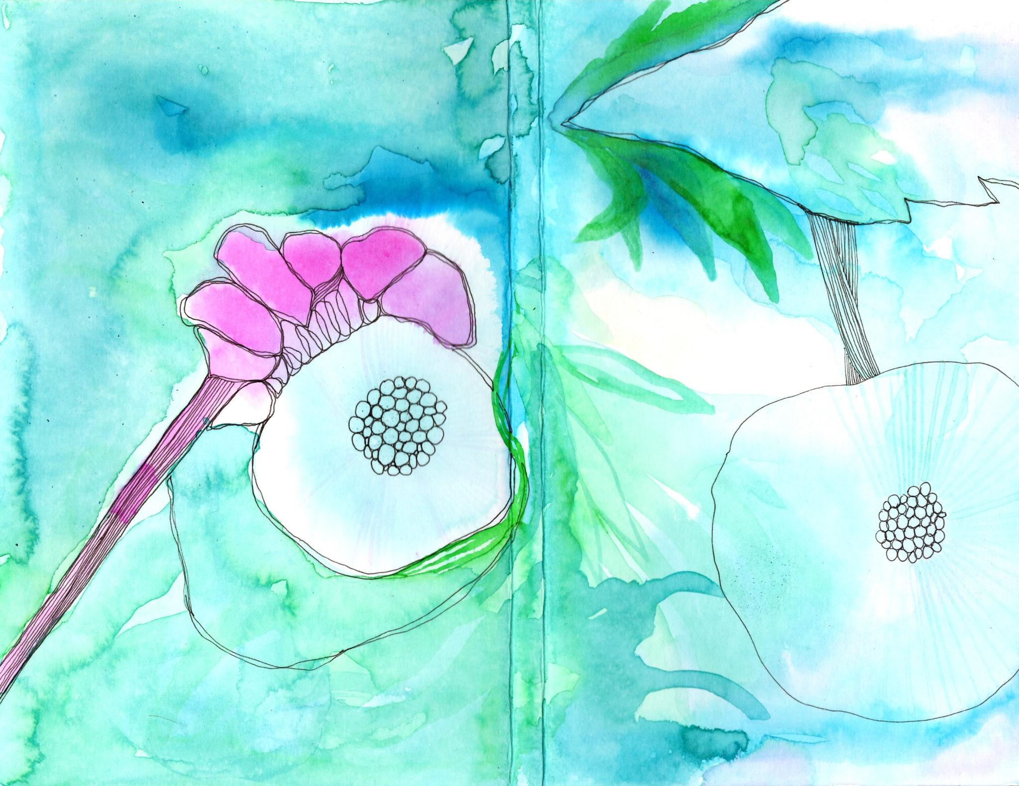 I was lucky enough to be one of 10 invited artists to create 15 original covers for the newest edition of Çedilla. Each person who purchases a copy of Ç viii (v. 8.0) will have the ability to choose a book with an artist-designed cover. It was a fun project, which I decided to use liquid watercolor, dye and pen to execute. Here's the results: